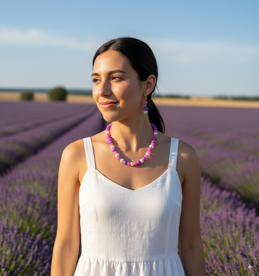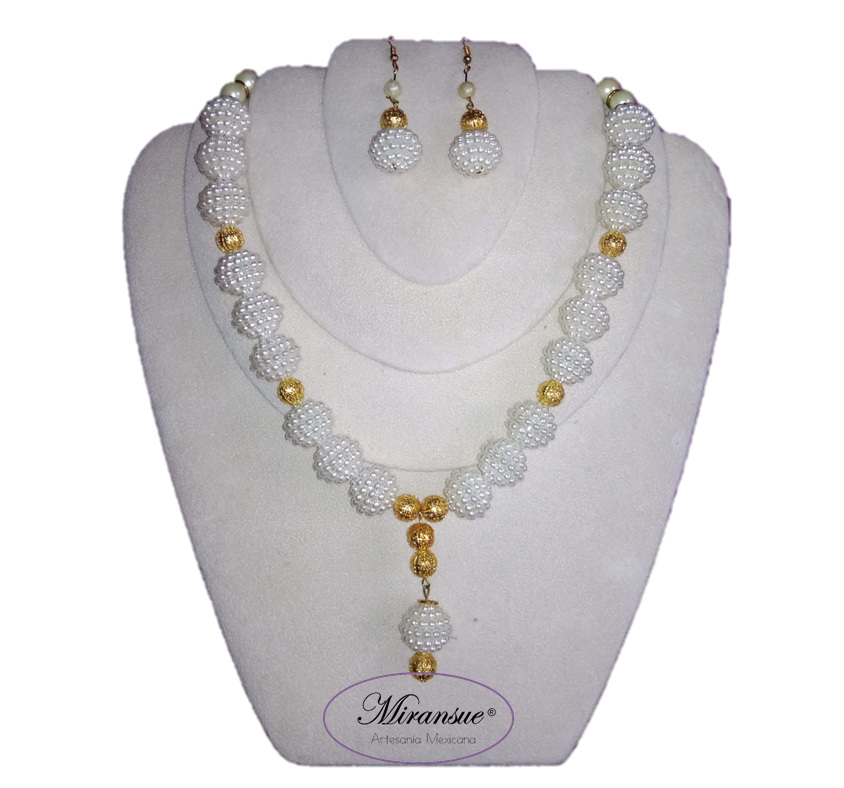 Hermoso juego de collar y aretes con perla terciopelo y dona de vidrio