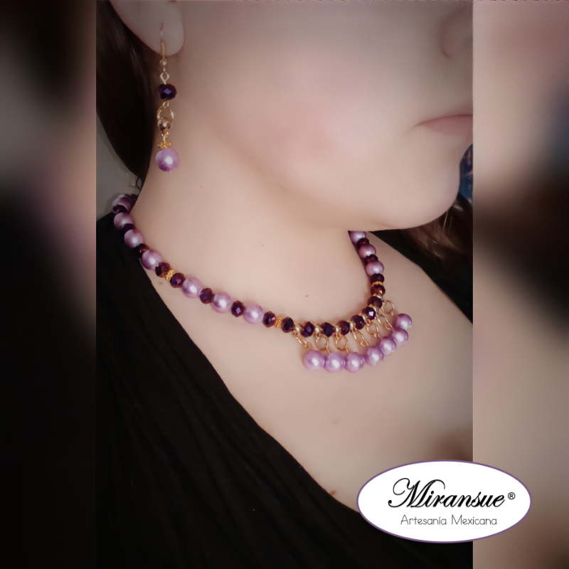 Hermoso juego de collar y aretes super elegante elaborado en cristal y perlas color lila, uva y dorado. Estilo cascada corto.