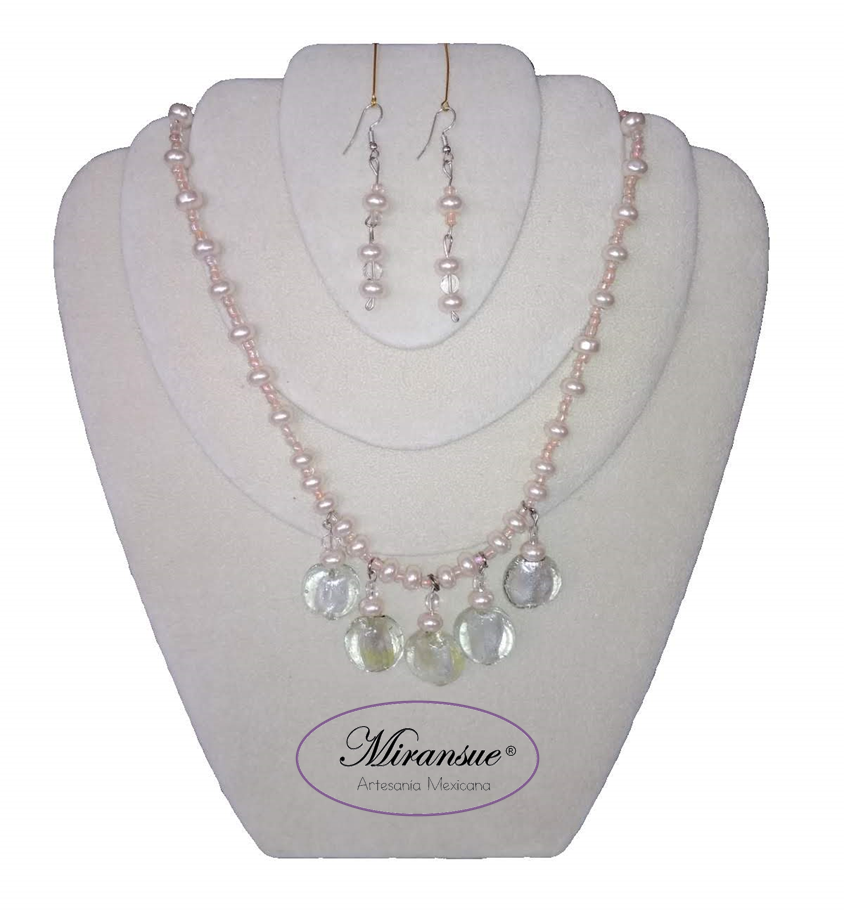 Hermoso y original juego de collar y aretes elaborados con cristal murano en color blanco y transparente con perlas en rosa y blanco.