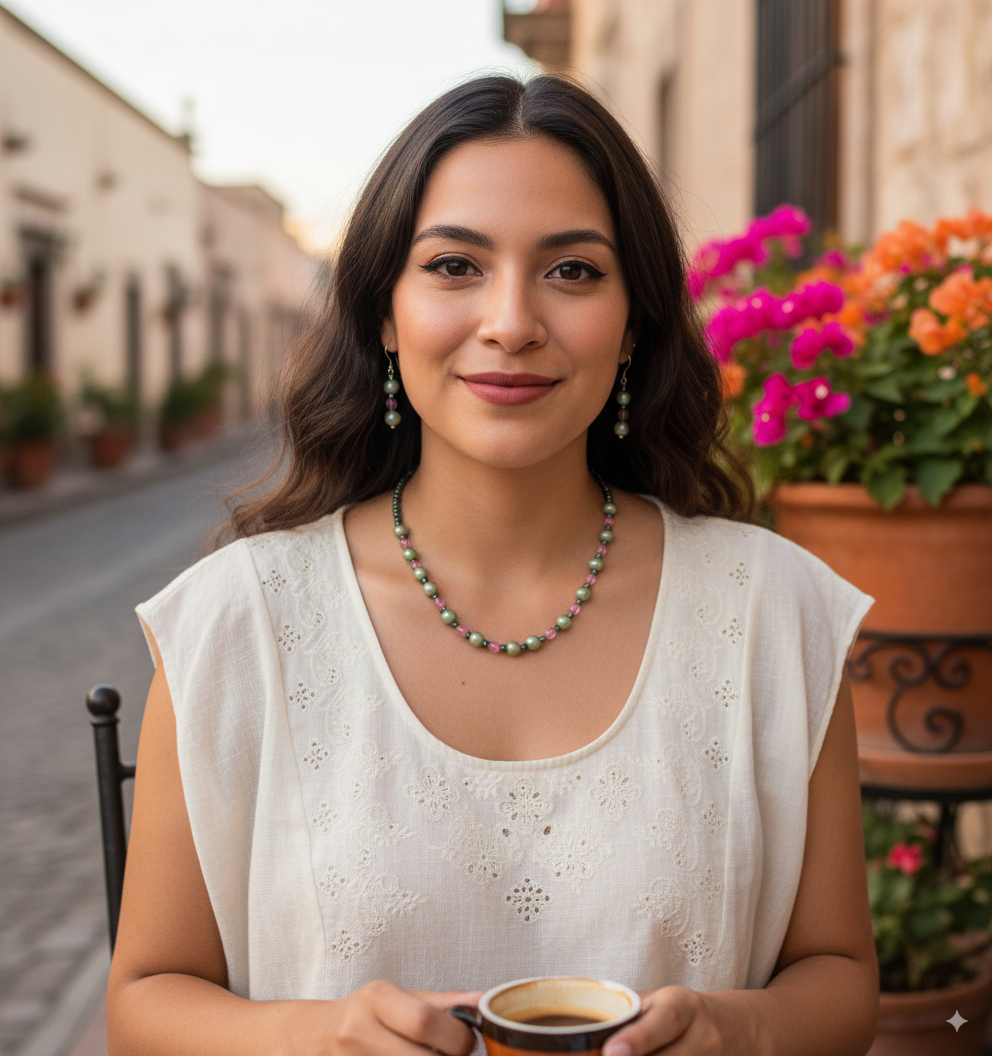 Original juego de collar y aretes color rosa, morado y blanco, tipo princesa, elaborado con vidrio y perlas. Incluye aretes.