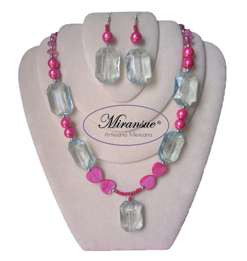 Hermoso juego de collar y aretes en tonos fucsia y azul, elaborado con cuentas de acrílico de gran tamaño, concha en forma de corazón, perlas de fantasía y chaquirón. Estilo princesa, con una longitud de 52 cm más 5 cm de caída del dije. ¡Una pieza excepcional que resalta tu estilo con un toque único y moderno!Collar y aretes fucsia 💖 azul 💙