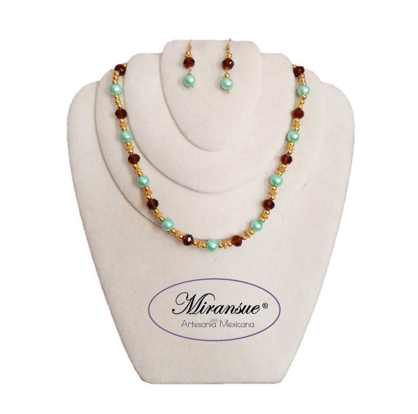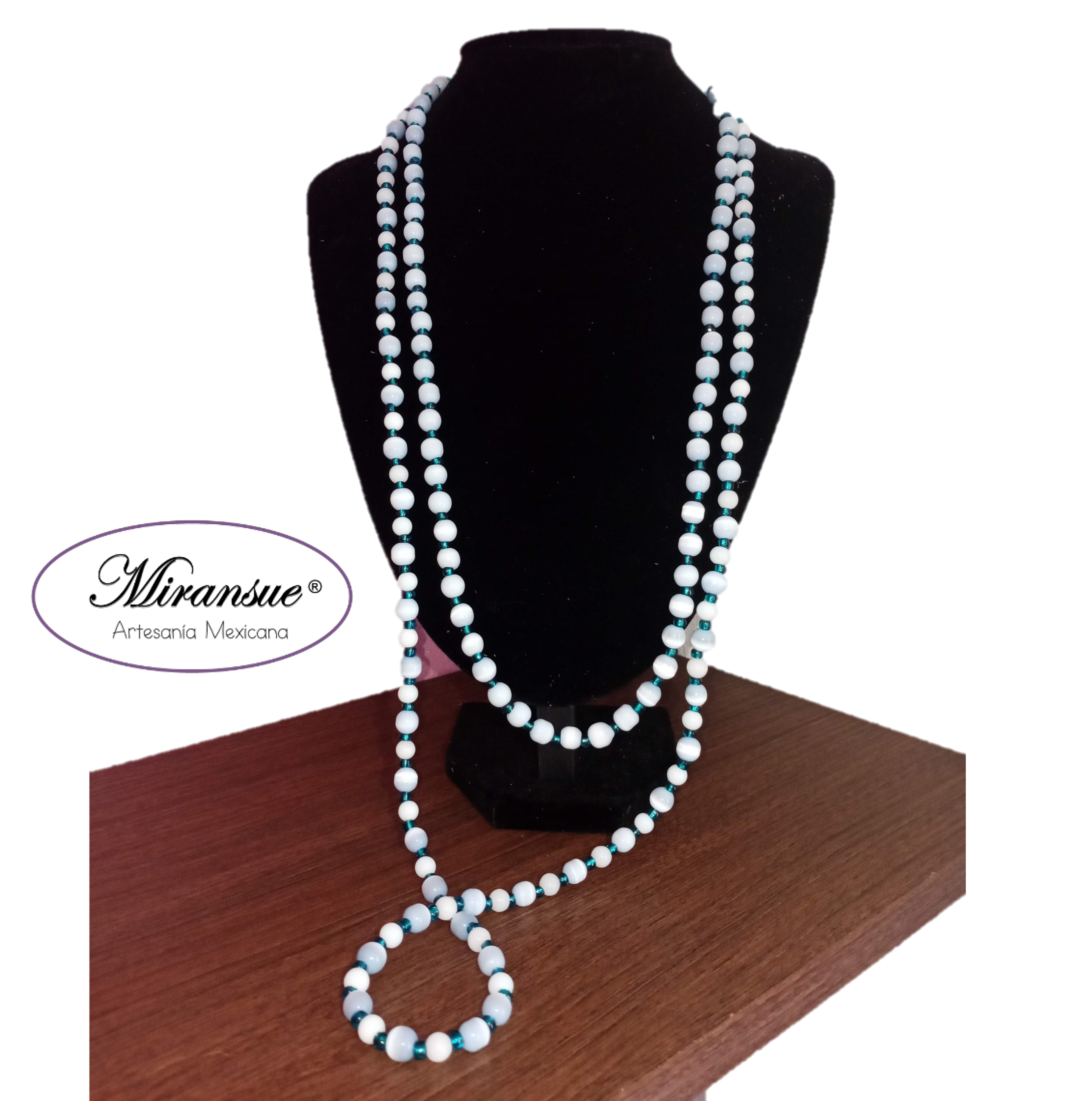 Hermoso y juvenil juego de collar y aretes elaborados con cristal tipo ojo de gato en azul cielo, estilo cuerda doble nivel, no incluye broche.