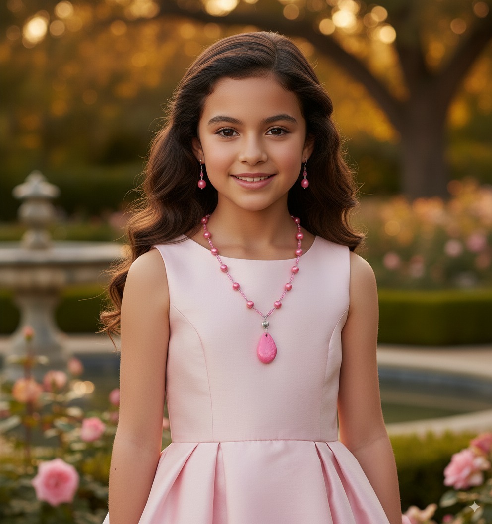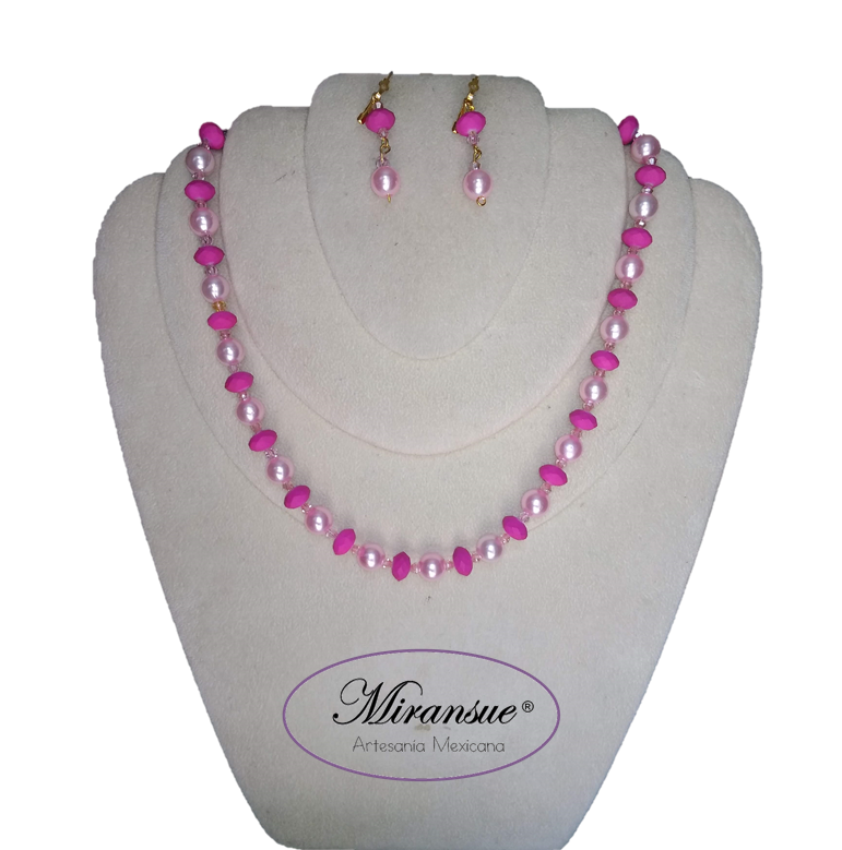 Elegante juego de collar y aretes rosa con fiucsa, elaborado con perlas de plástico y caucho. Ligero, estilo princesa. Incluye aretes